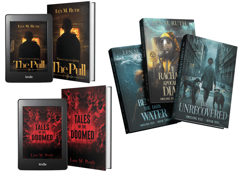 Len M. Ruth is the author of the horror novels The Pull, Rachael’s Apocalypse Diary, The Unrecovered, Tales of the Doomed, and Beneath the Dark Water. He co-authors the Spectral Seduction series with Devora Gray, adding steamy paranormal heat to his library of titles. His work appears in the anthologies Satan Rides Your Daughter and Love’s Dark Side, and he’s been featured at the Flash Fiction Forum. You can find his books wherever fine ebooks are sold. Len is part of the LGBTQ community and lives in fabulous Las Vegas, Nevada with his partner, Emory, and their dog, Cooper.
